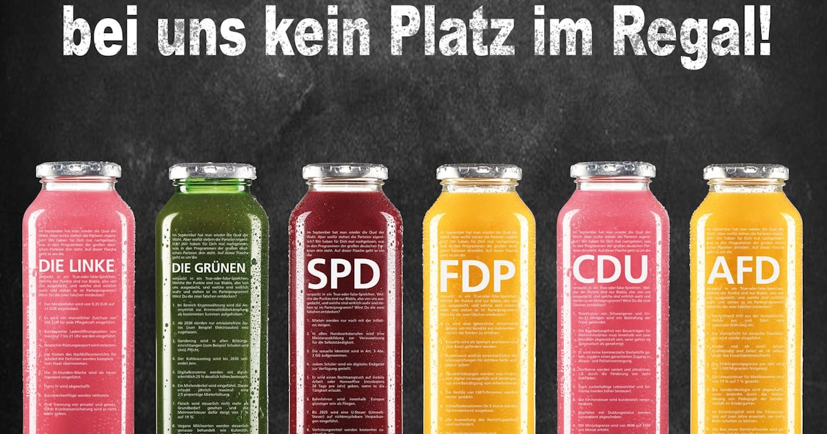 True Fruits hat Flaschen mit Auszügen aus den Wahlprogrammen vieler Parteien etikettiert. Anlässlich der anstehenden Bundestagswahl hat das Saft-Unternehmen. Der Getränkehersteller hat vor der Bundestagswahl Auszüge des Parteiprogramms abgedruckt.